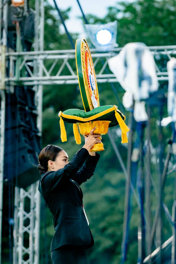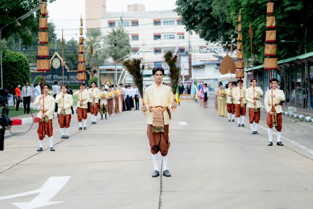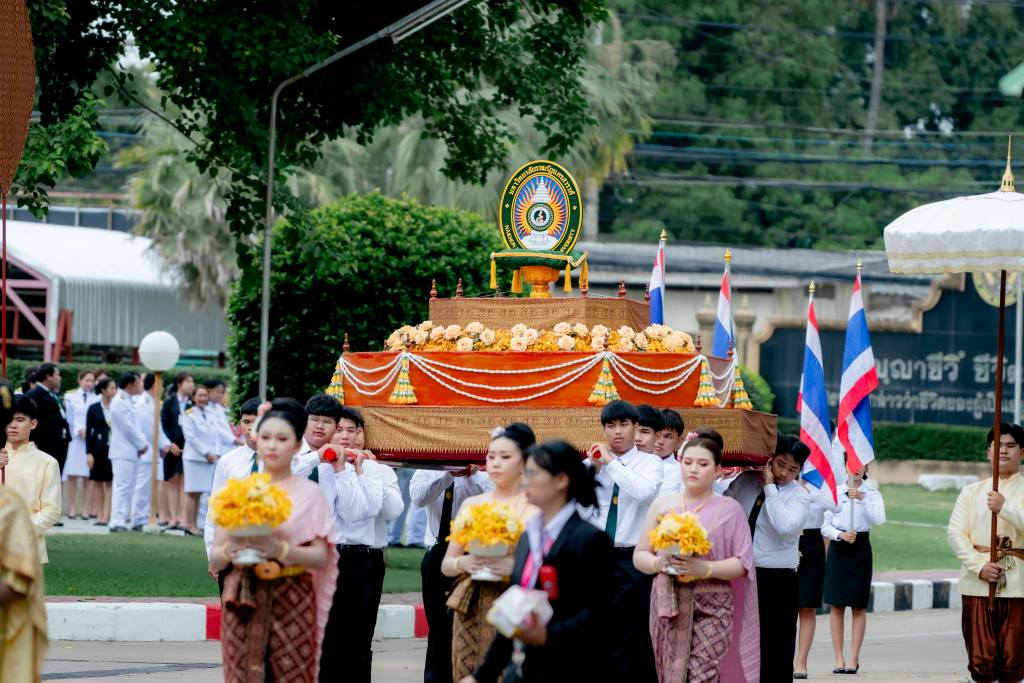 พิธีเริ่มต้นด้วยการอัญเชิญตราพระราชลัญจกร ซึ่งเป็นสัญลักษณ์อันทรงคุณค่าของมหาวิทยาลัยราชภัฏ โดยคณะผู้บริหารและคณาจารย์ได้ตั้งขบวนอย่างสง่างาม ณ บริเวณลานหน้าองค์พระพุทธสัพพัญญูฯ เพื่ออัญเชิญตราพระราชลัญจกรขึ้นประดิษฐานบนเสลี่ยง และเคลื่อนขบวนเข้าสู่สนามฟุตบอลอย่างพร้อมเพรียง