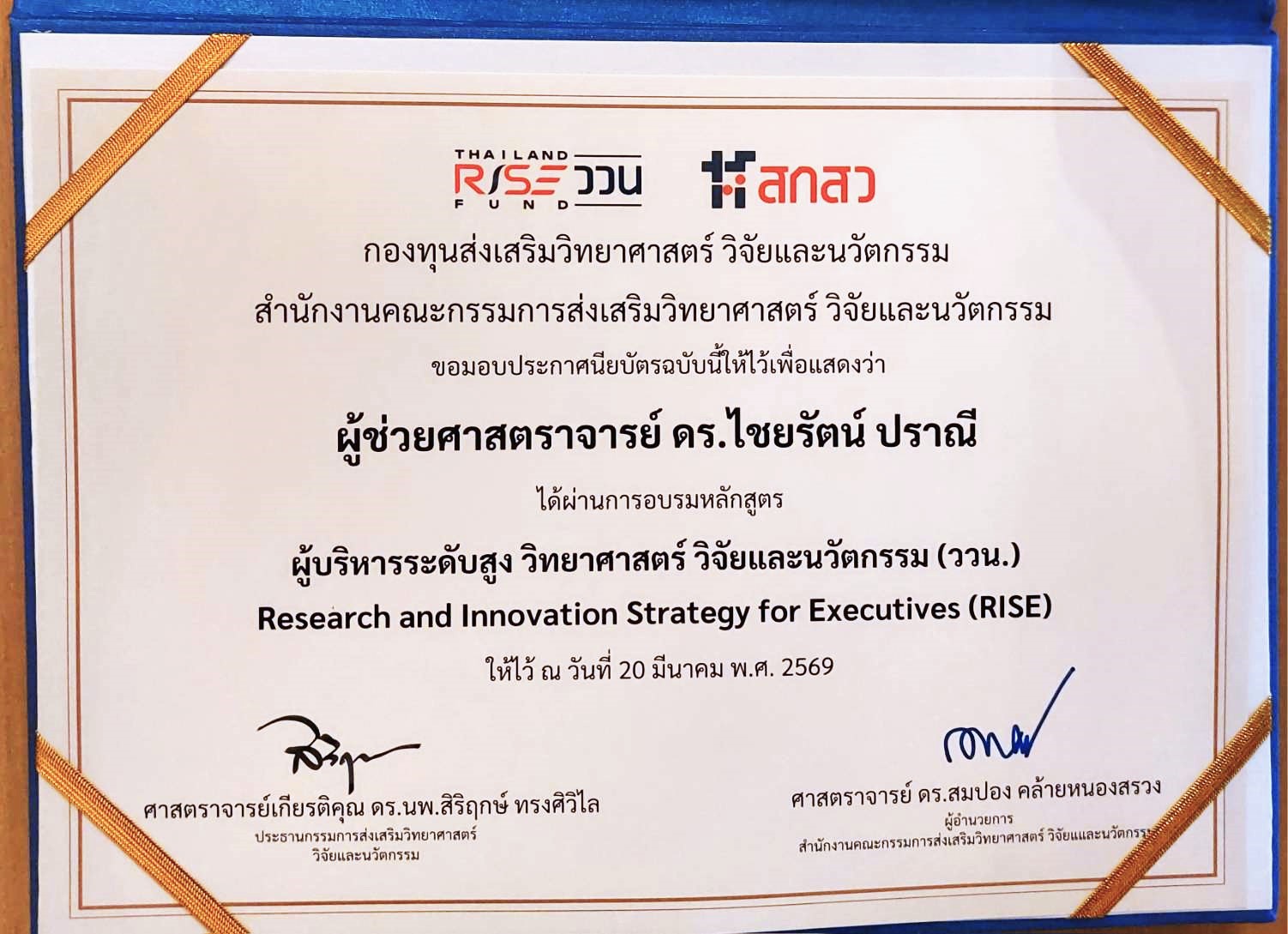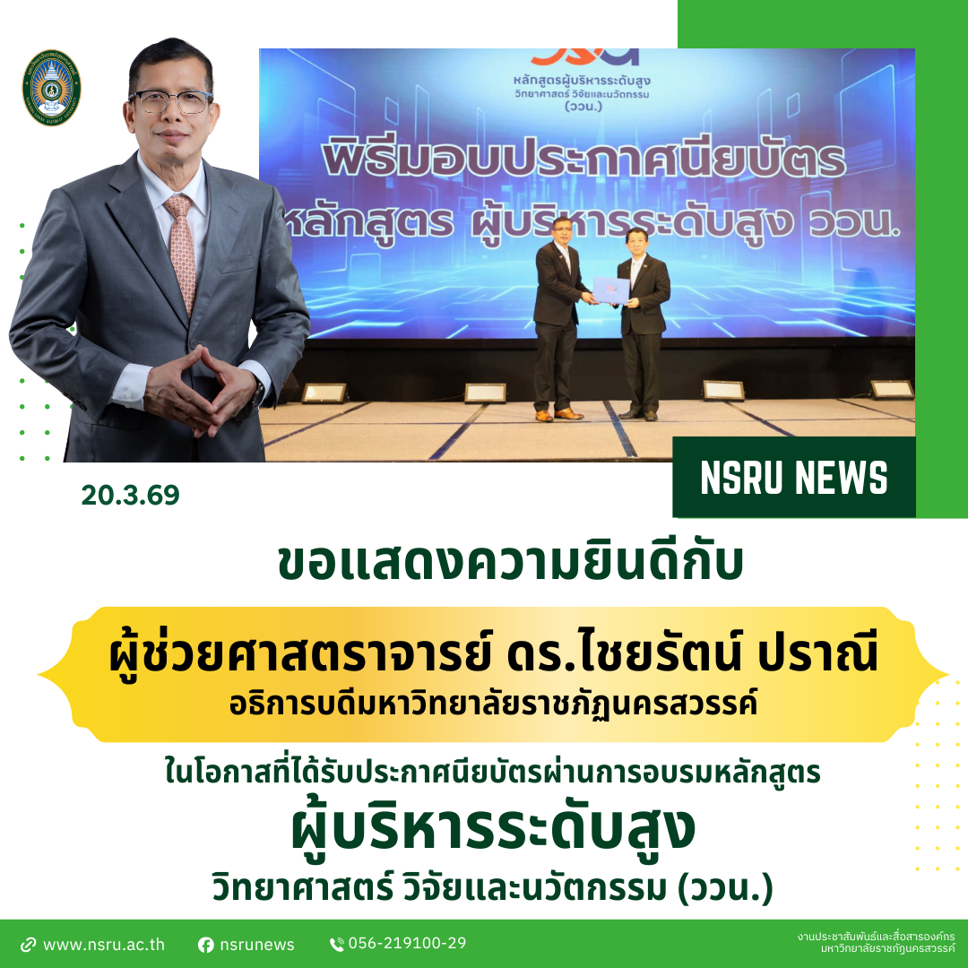 มหาวิทยาลัยราชภัฏนครสวรรค์ ขอแสดงความยินดีอย่างยิ่งกับ ผู้ช่วยศาสตราจารย์ ดร.ไชยรัตน์ ปราณี อธิการบดีมหาวิทยาลัยราชภัฏนครสวรรค์ ในโอกาสสำเร็จการอบรมหลักสูตร "ผู้บริหารระดับสูง วิทยาศาสตร์ วิจัยและนวัตกรรม (ววน.)" หรือ Research and Innovation Strategy for Executives (RISE) เมื่อวันที่ 20 มีนาคม พ.ศ. 2569 ณ โรงแรมแมริออท กรุงเทพมหานคร