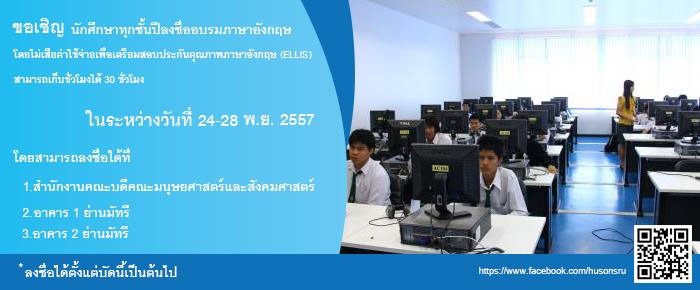 ขอเชิญ...นักศึกษาทุกชั้นปี ลงชื่ออบรมภาษาอังกฤษโดยไม่เสียค่าใช้จ่าย เพื่อเตรียมสอบประกันคุณภาพภาษาอังกฤษ (ELLIS) สามารถเก็บชั่วโมงได้ 30 ชั่วโมง ในระหว่างวันที่ 24-28 พ.ย. 2557