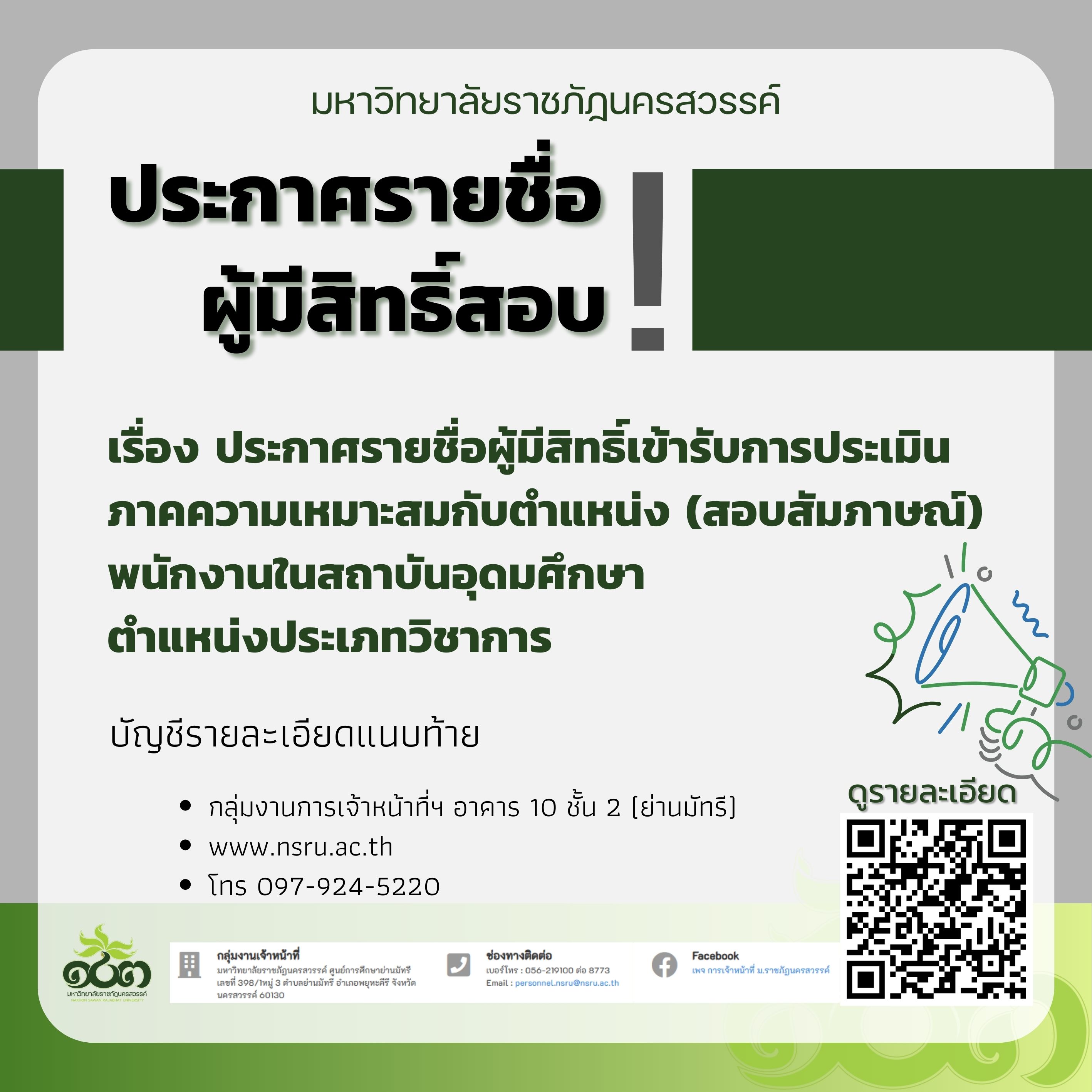 ประกาศรายชื่อผู้มีสิทธิ์เข้ารับการประเมินภาคความเหมาะสมกับตำแหน่ง (สอบสัมภาษณ์) พนักงานในสถาบันอุดมศึกษา ตำแหน่งประเภทวิชาการ