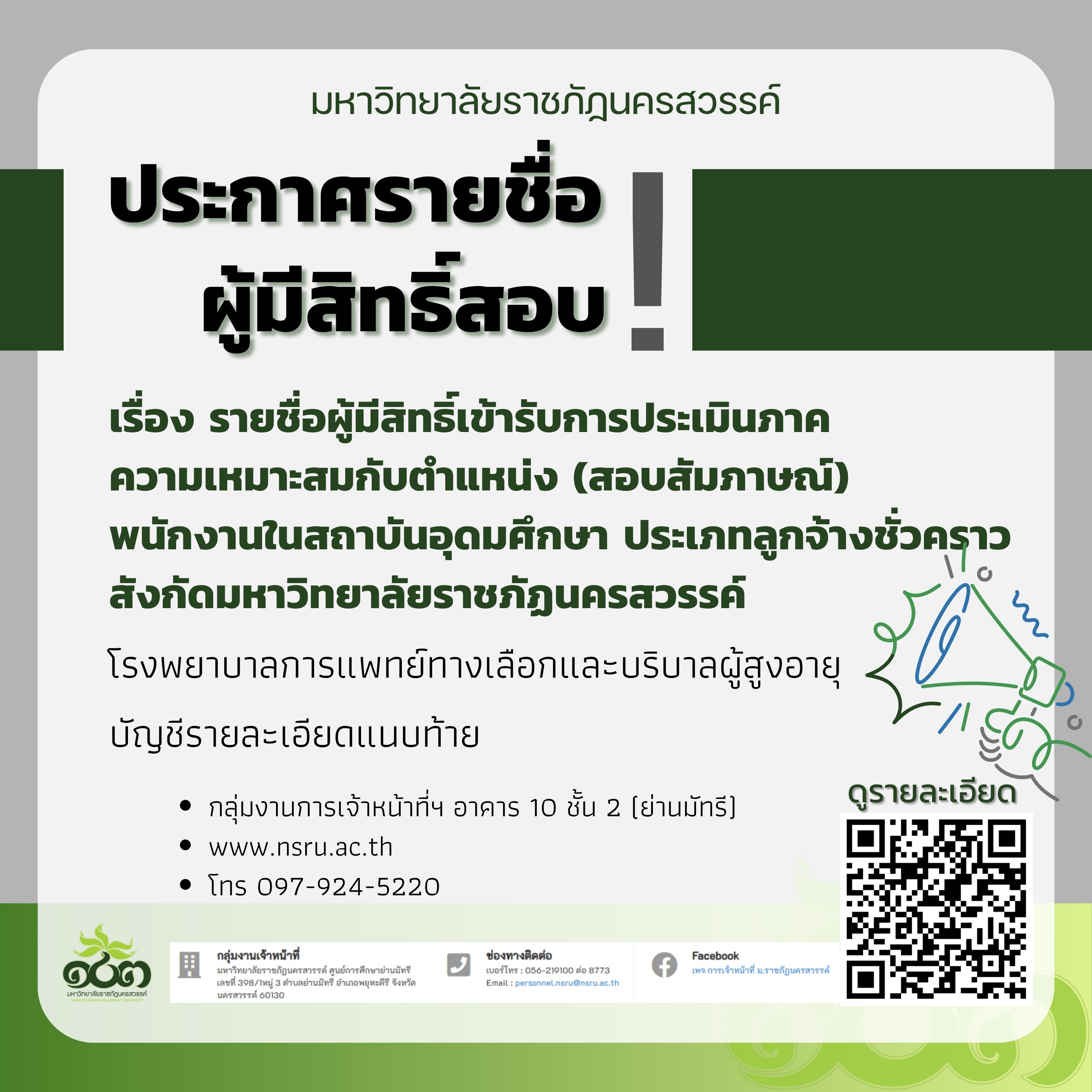 รายชื่อผู้มีสิทธิ์เข้ารับการประเมินภาคความเหมาะสมกับตำแหน่ง (สอบสัมภาษณ์) พนักงานในสถาบันอุดมศึกษา ประเภทลูกจ้างชั่วคราว สังกัดมหาวิทยาลัยราชภัฏนครสวรรค์
