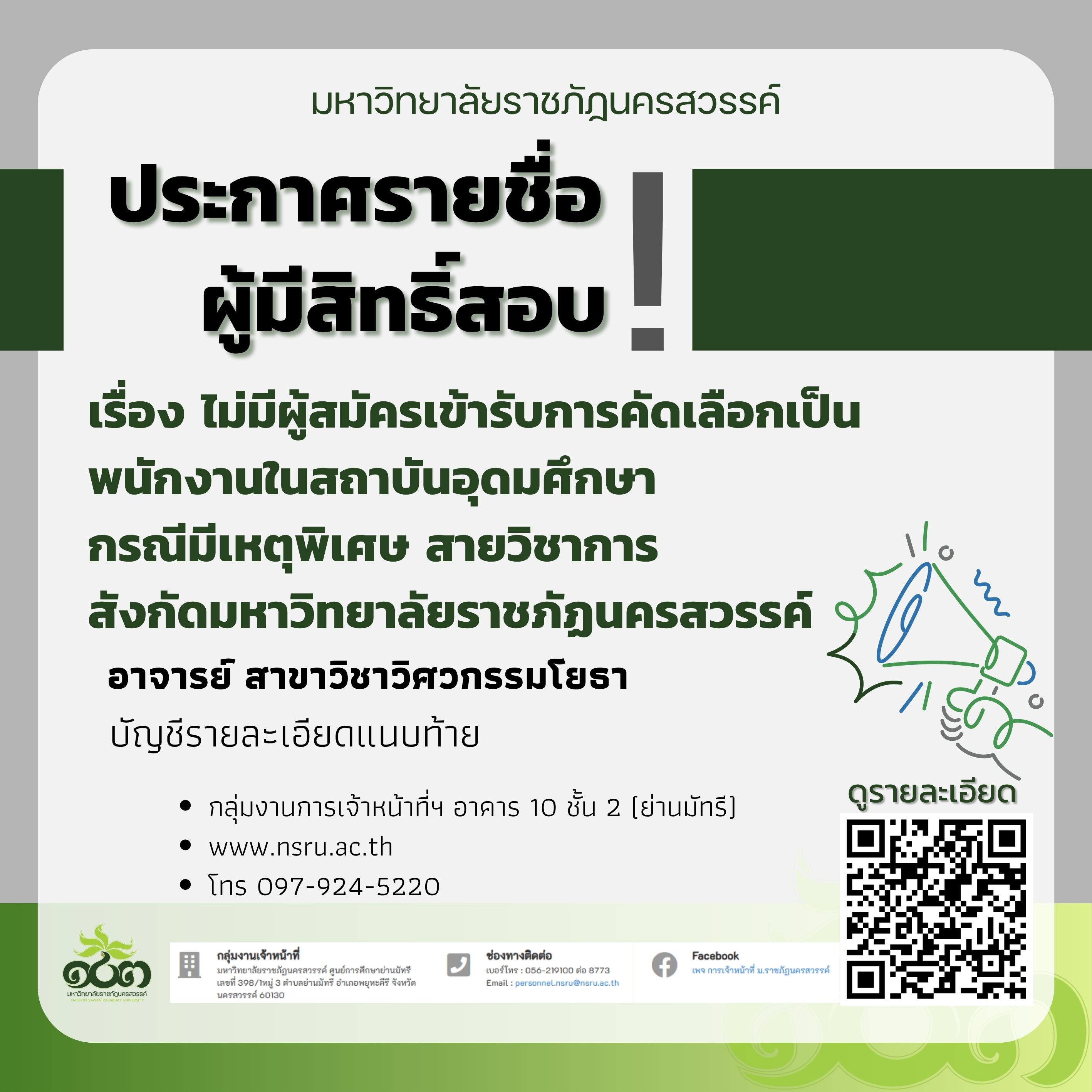 ไม่มีผู้สมัครเข้ารับการคัดเลือกเป็นพนักงานในสถาบันอุดมศึกษา กรณีมีเหตุพิเศษ สายวิชาการ สังกัดมหาวิทยาลัยราชภัฏนครสวรรค์