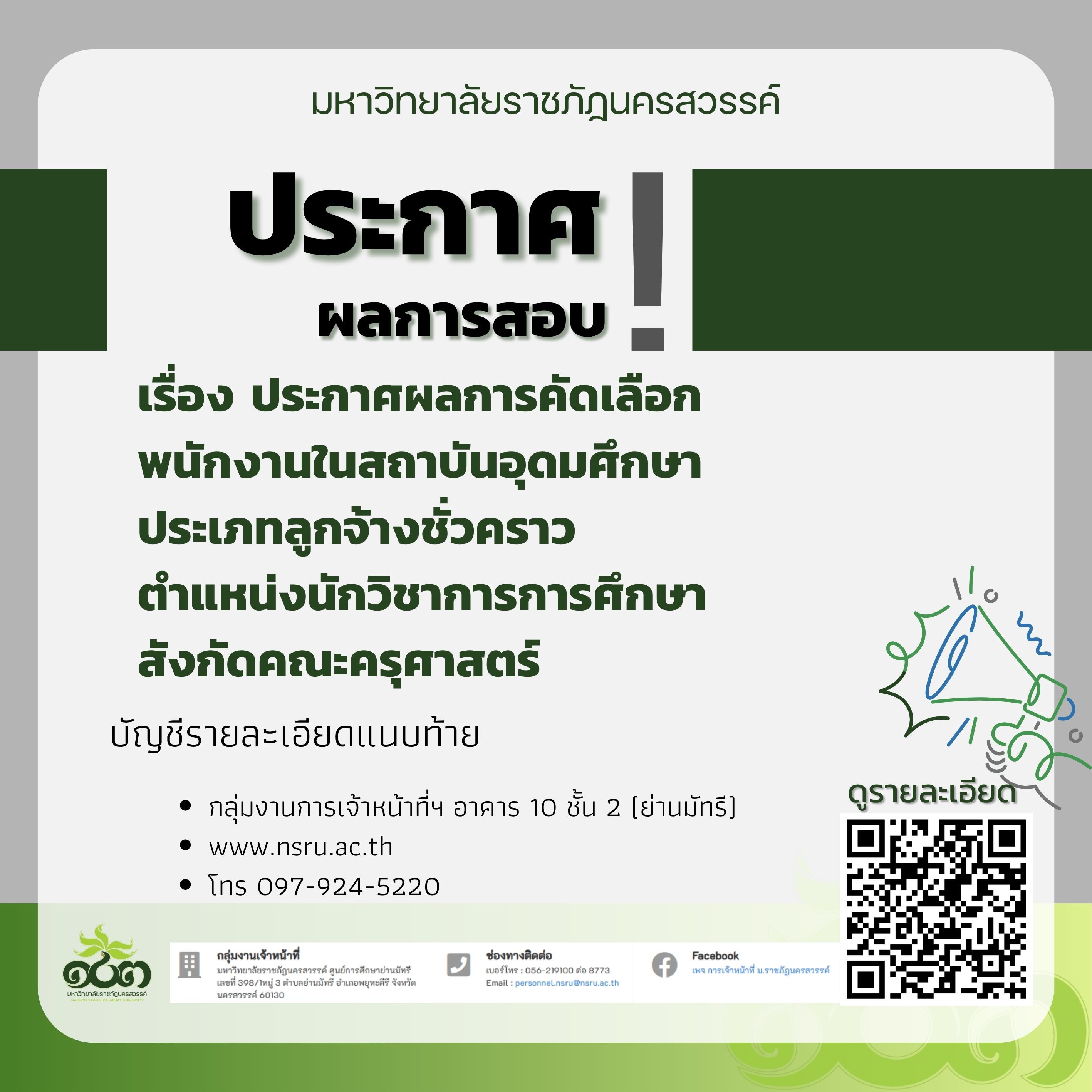ประกาศผลการคัดเลือกพนักงานในสถาบันอุดมศึกษา ประเภทลูกจ้างชั่วคราว ตำแหน่งนักวิชาการศึกษา สังกัดคณะครุศาสตร์