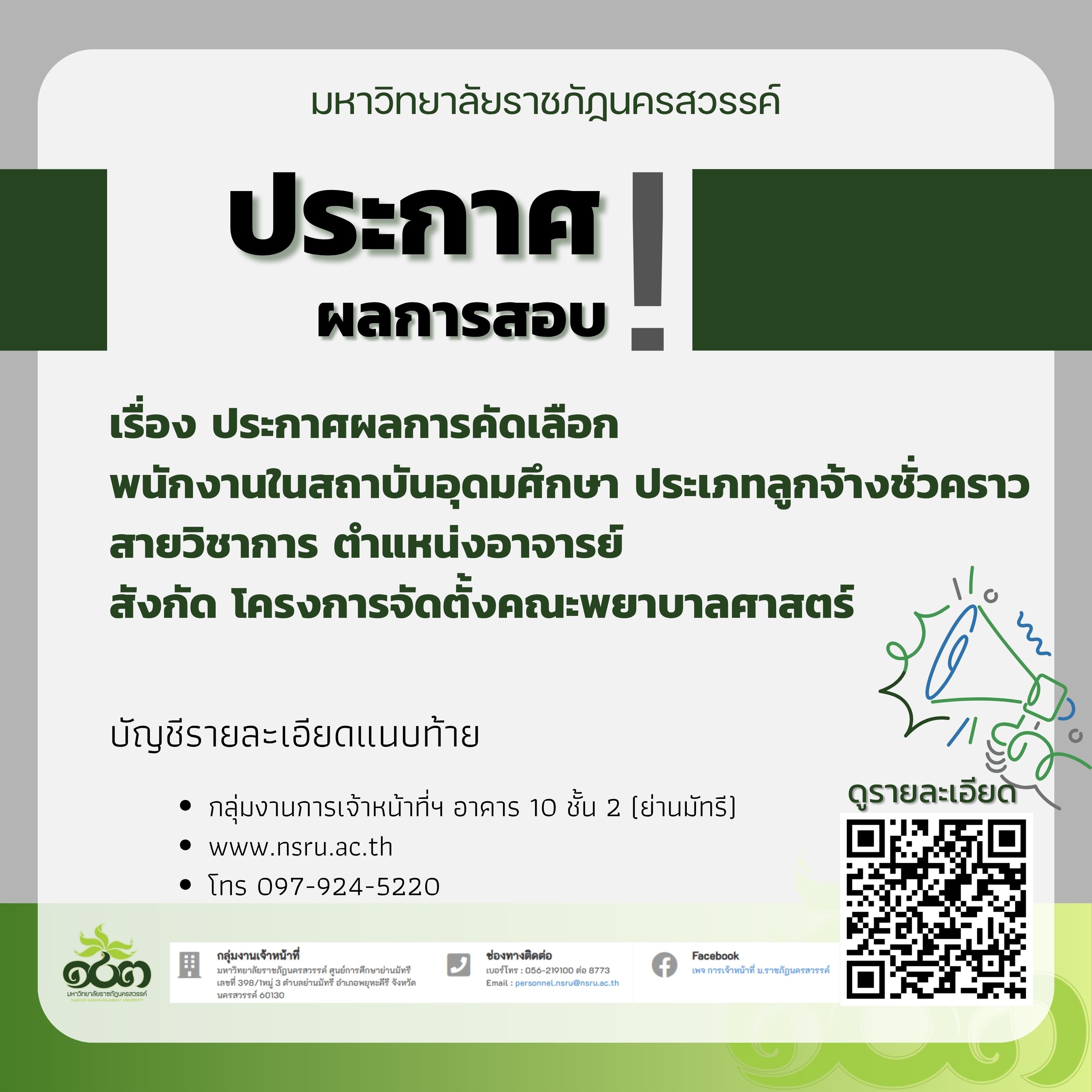 ประกาศผลการคัดเลือกพนักงานในสถาบันอุดมศึกษา ประเภทลูกจ้างชั่วคราว สายวิชาการ ตำแหน่งอาจารย์ สังกัด โครงการจัดตั้งคณะพยาบาลศาสตร์