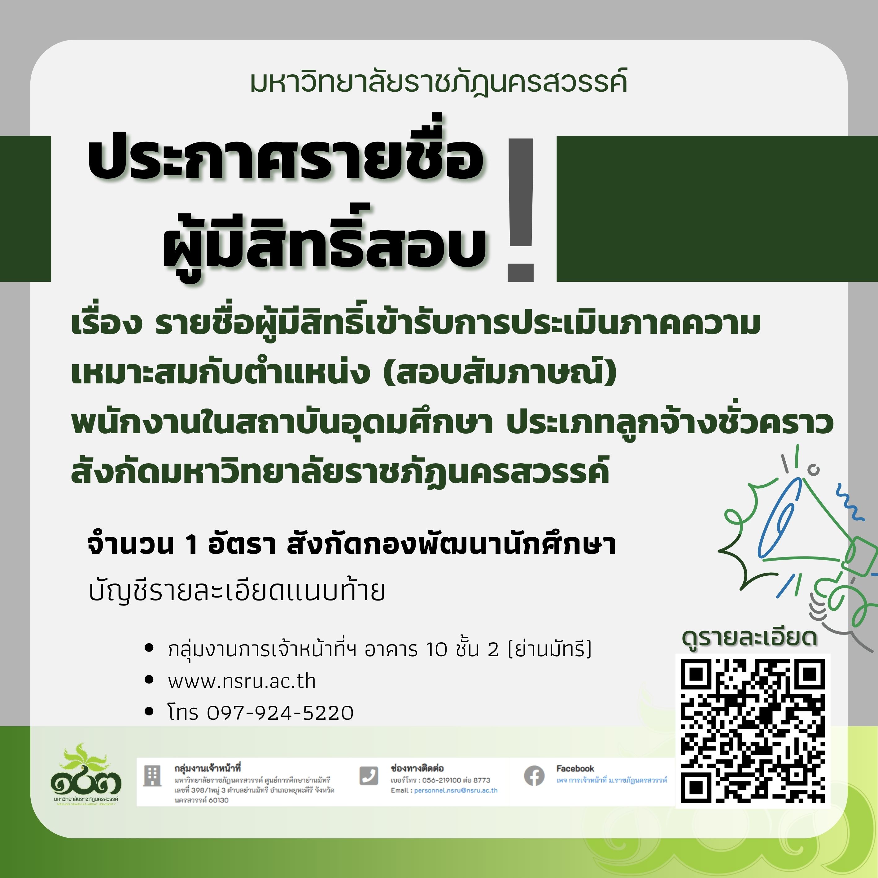 รายชื่อผู้มีสิทธิ์เข้ารับการประเมินภาคความเหมาะสมกับตำแหน่ง (สอบสัมภาษณ์) พนักงานในสถาบันอุดมศึกษา ประเภทลูกจ้างชั่วคราว สังกัดมหาวิทยาลัยราชภัฏนครสวรรค์