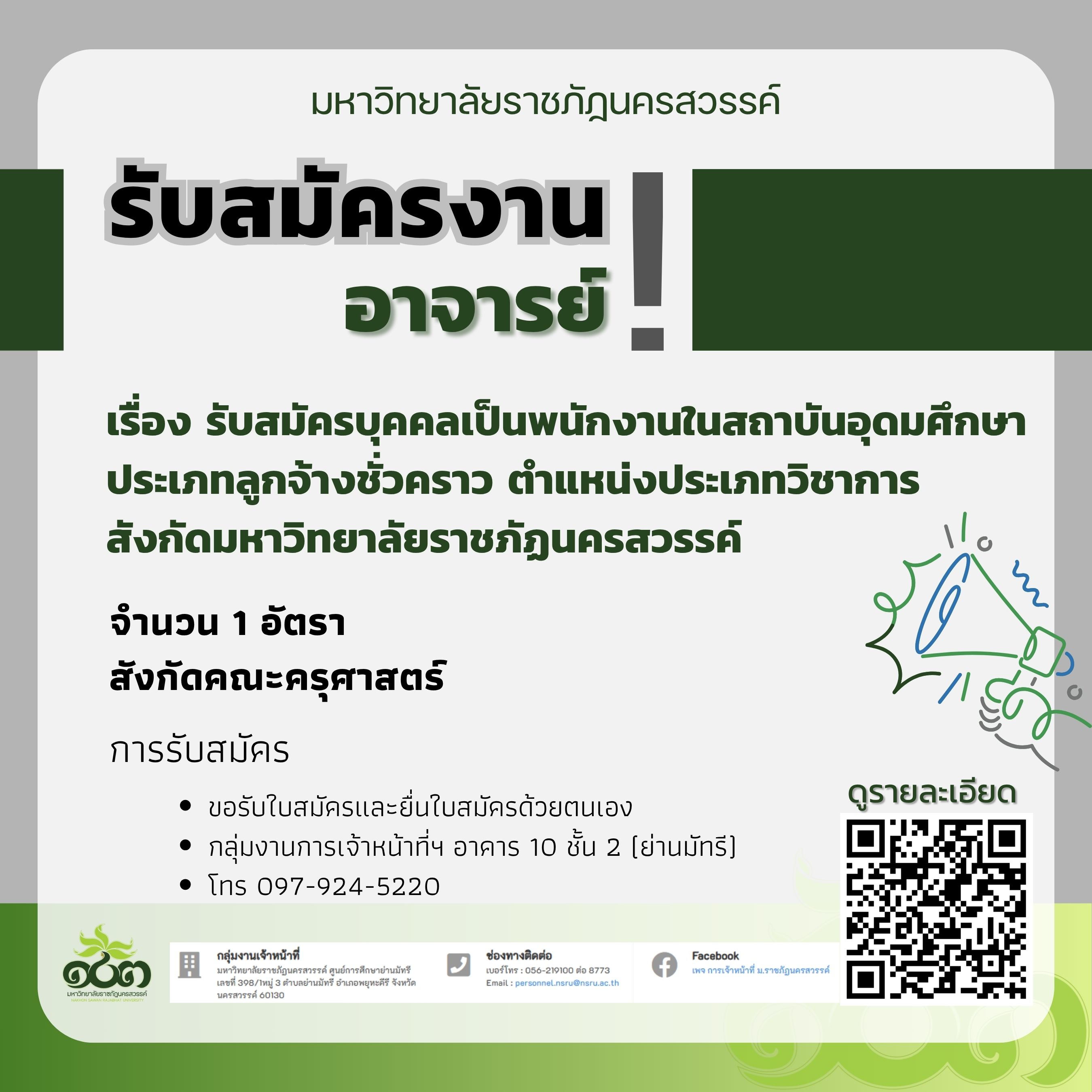 รับสมัครบุคคลเป็นพนักงานในสถาบันอุดมศึกษาประเภทลูกจ้างชั่วคราว ตำแหน่งประเภทวิชาการ สังกัดมหาวิทยาลัยราชภัฏนครสวรรค์
