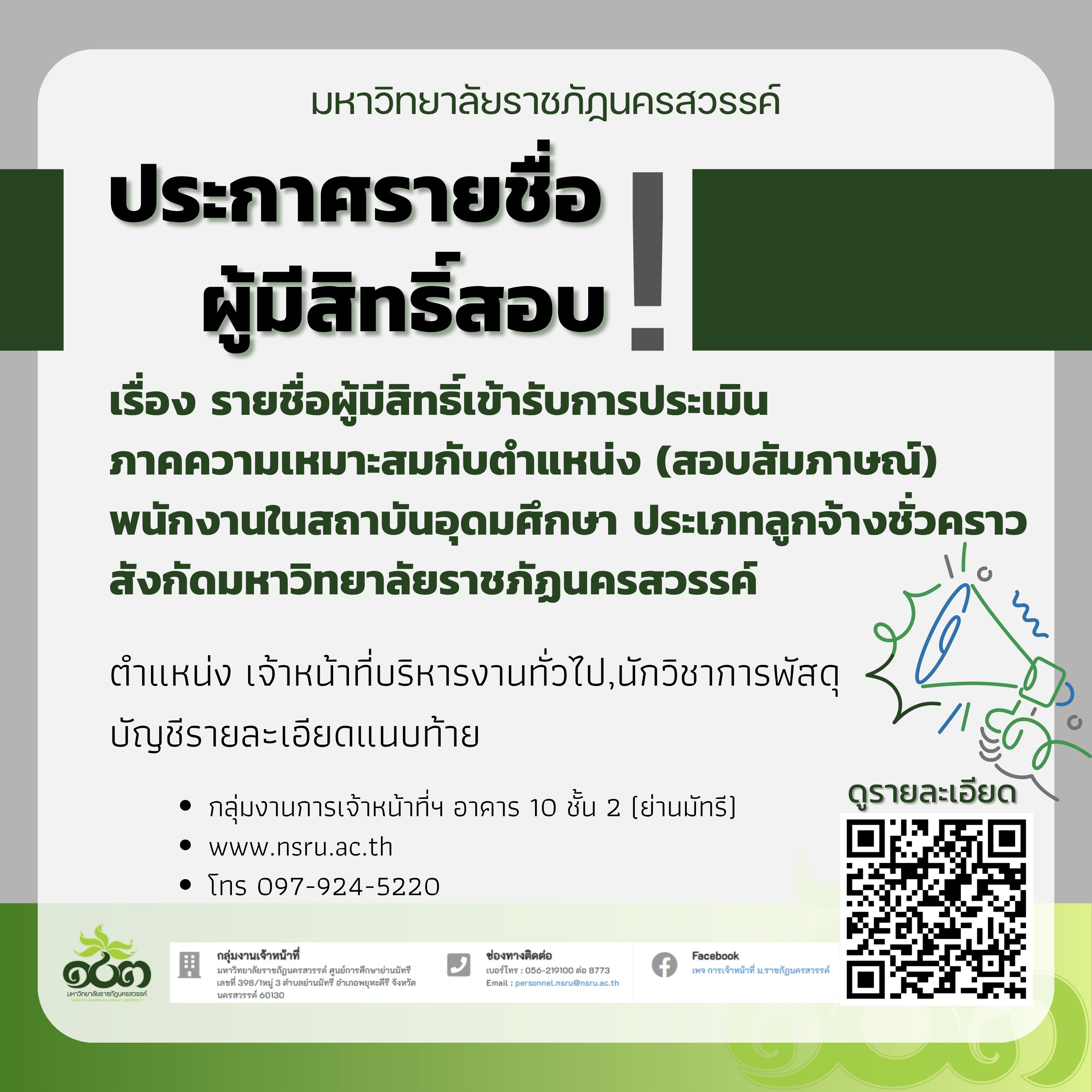รายชื่อผู้มีสิทธิ์เข้ารับการประเมินภาคความเหมาะสมกับตำแหน่ง (สอบสัมภาษณ์) พนักงานในสถาบันอุดมศึกษา ประเภทลูกจ้างชั่วคราว สังกัดมหาวิทยาลัยราชภัฏนครสวรรค์