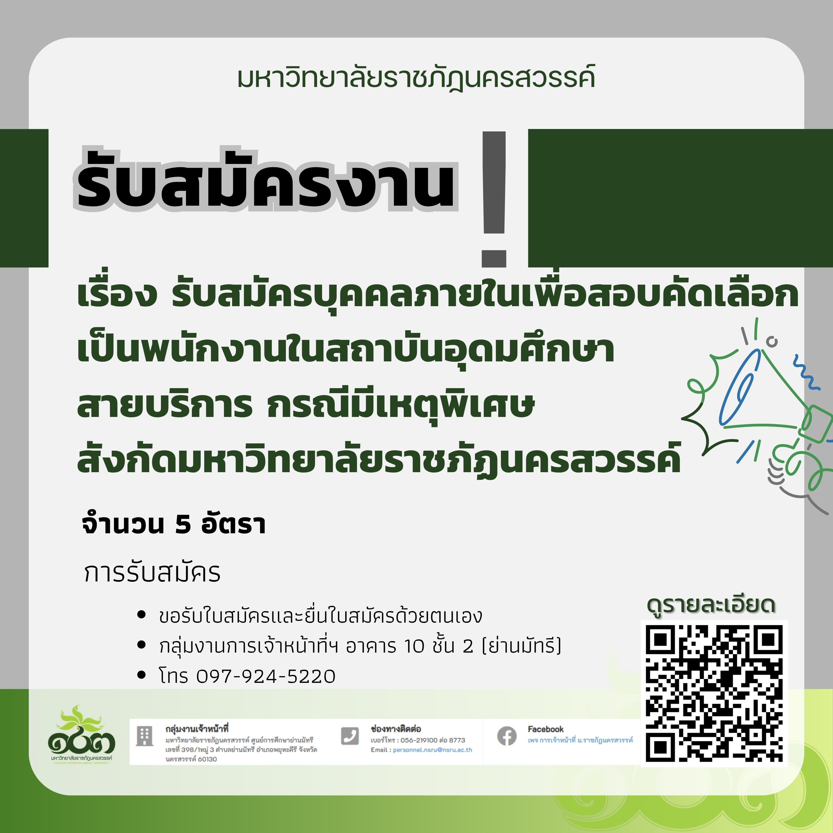 รับสมัครบุคคลภายในเพื่อสอบคัดเลือกเป็นพนักงานในสถาบันอุดมศึกษา สายบริการ กรณีมีเหตุพิเศษ สังกัดมหาวิทยาลัยราชภัฏนครสวรรค์