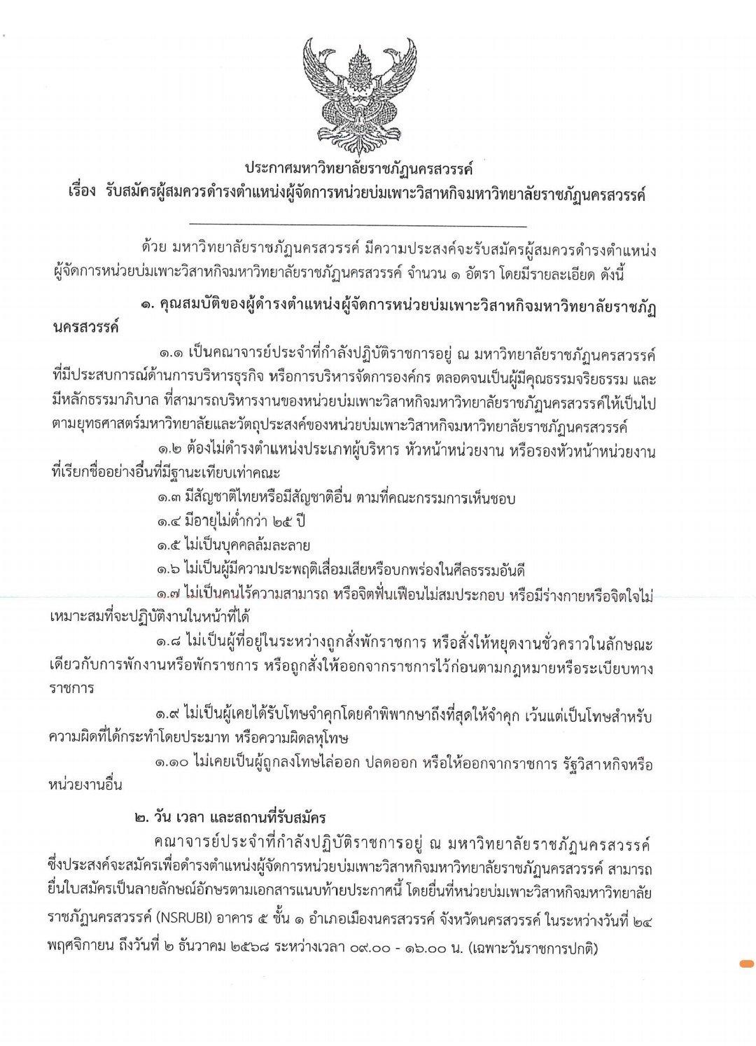 ประกาศจากมหาวิทยาลัยราชภัฏนครสวรรค์ เรื่อง รับสมัครผู้สมควรดำรงตำแหน่งผู้จัดการหน่วยบ่มเพาะวิสาหกิจ มหาวิทยาลัยราชภัฏนครสวรรค์