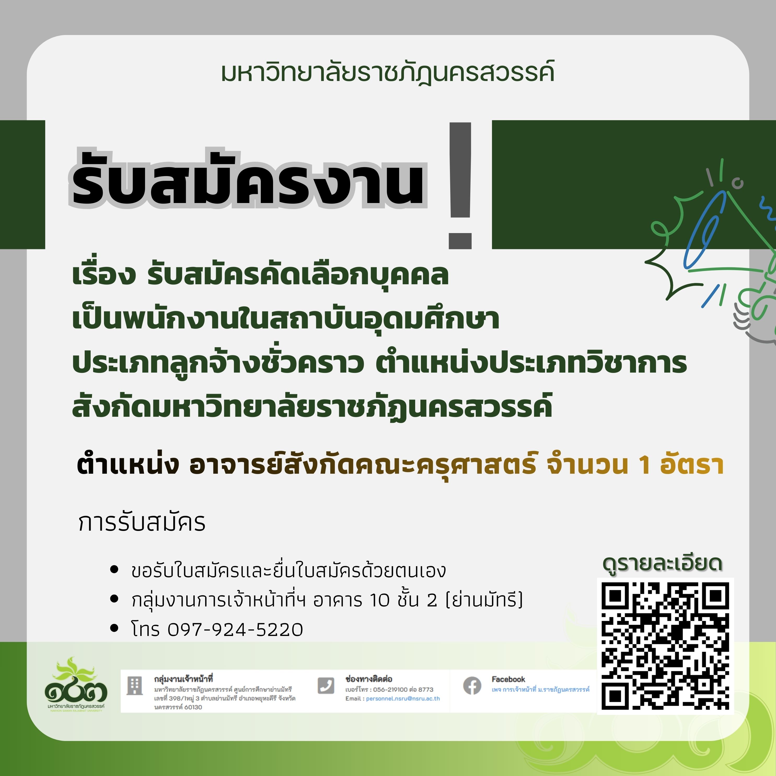 รับสมัครคัดเลือกบุคคลเป็นพนักงานในสถาบันอุดมศึกษา ประเภทลูกจ้างชั่วคราว ตำแหน่งประเภทวิชาการ สังกัดมหาวิทยาลัยราชภัฏนครสวรรค์