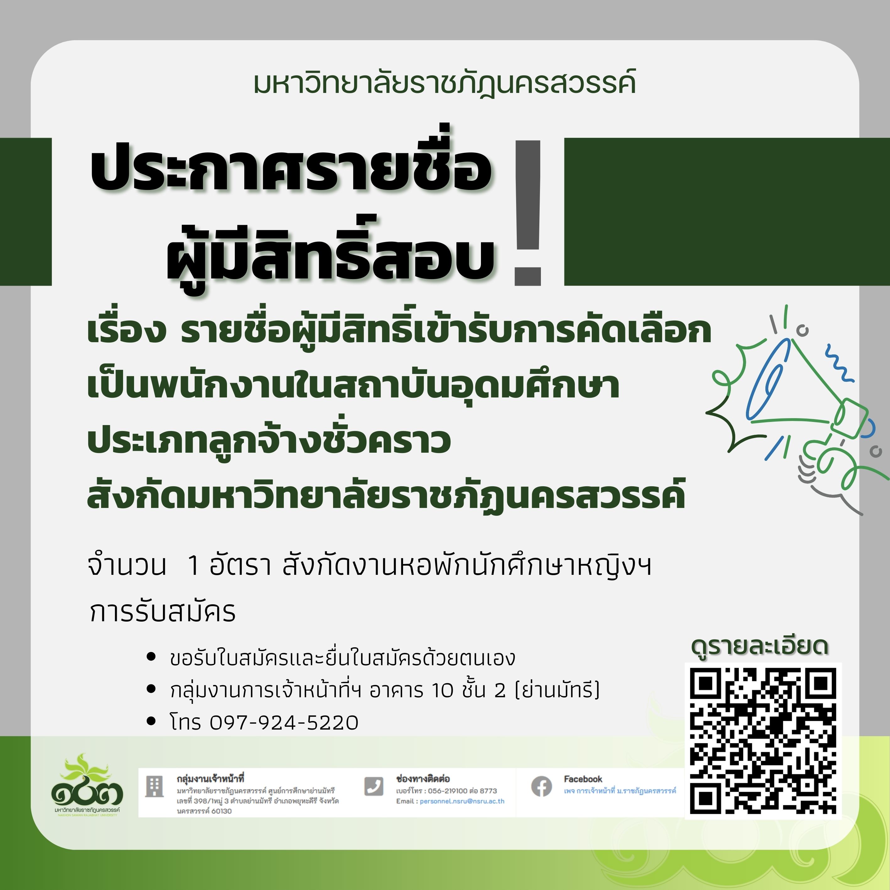 รายชื่อผู้มีสิทธิ์เข้ารับการคัดเลือกเป็นพนักงานในสถาบันอุดมศึกษา ประเภทลูกจ้างชั่วคราว สังกัดมหาวิทยาลัยราชภัฏนครสวรรค์
