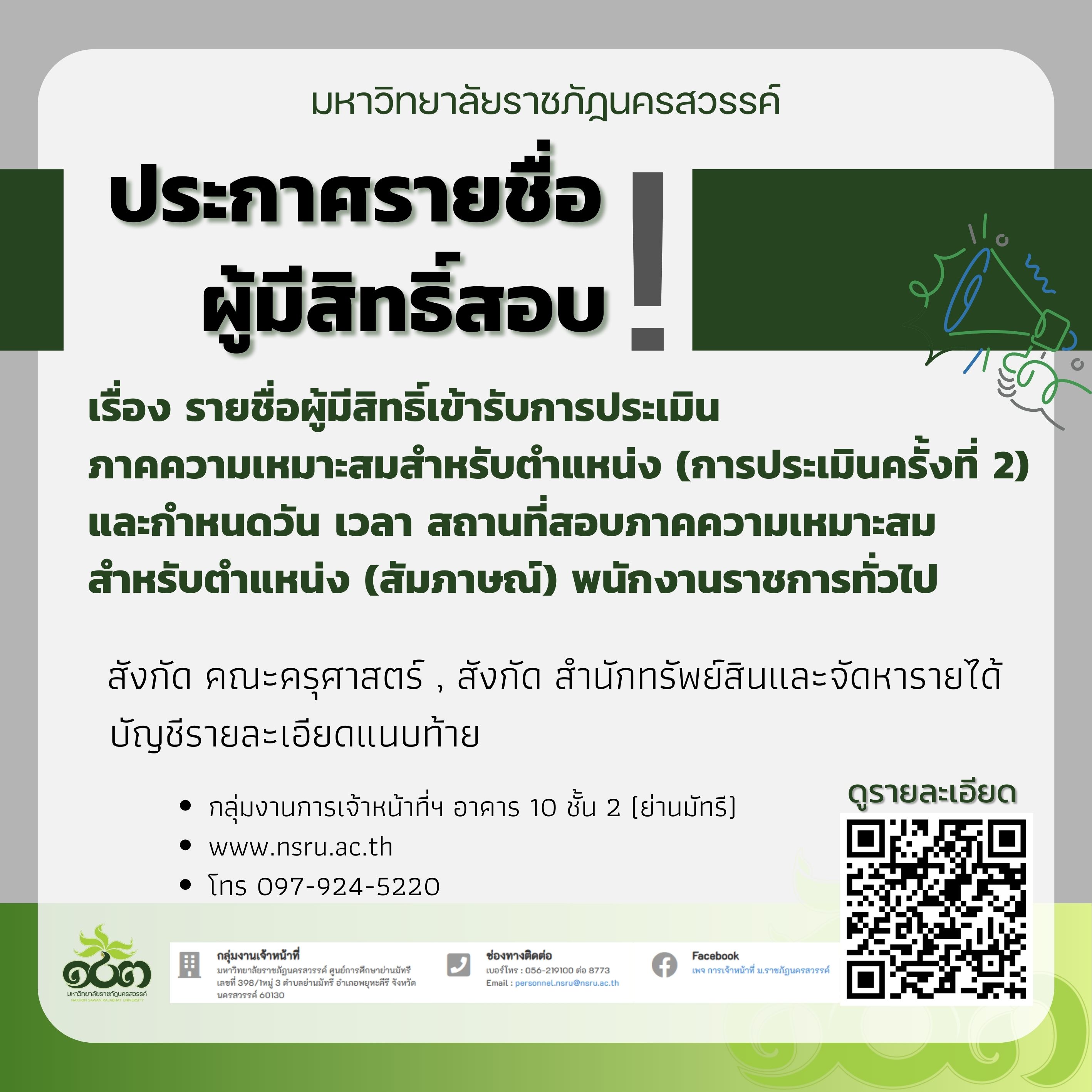 รายชื่อผู้มีสิทธิ์เข้ารับการประเมินภาคความเหมาะสมสำหรับตำแหน่ง (การประเมินครั้งที่ 2) และกำหนดวัน เวลา สถานที่สอบภาคความเหมาะสมสำหรับตำแหน่ง (สัมภาษณ์) พนักงานราชการทั่วไป