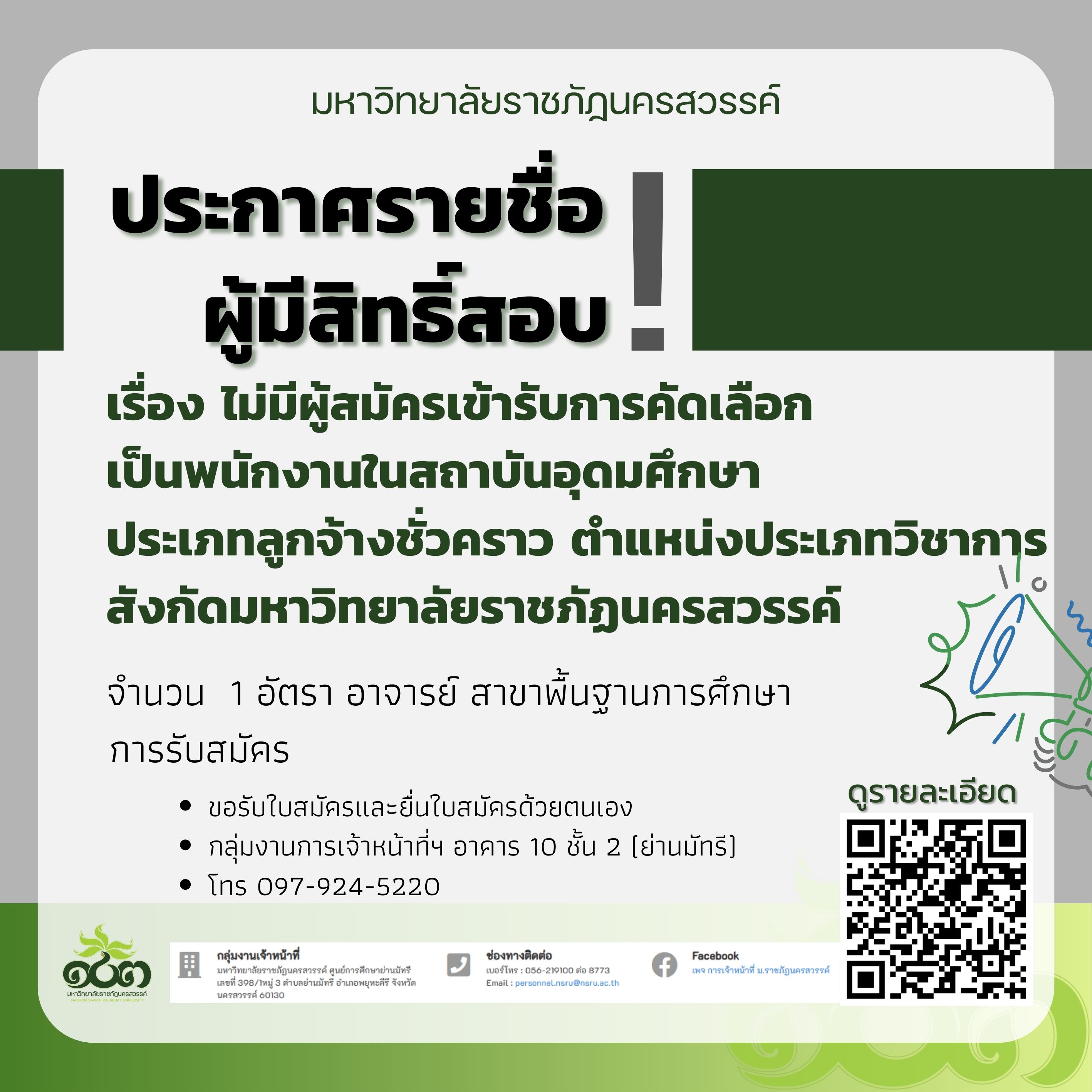 ไม่มีผู้สมัครเข้ารับการคัดเลือกเป็นพนักงานในสถาบันอุดมศึกษา ประเภทลูกจ้างชั่วคราว ตำแหน่งประเภทวิชาการ สังกัดมหาวิทยาลัยราชภัฏนครสวรรค์