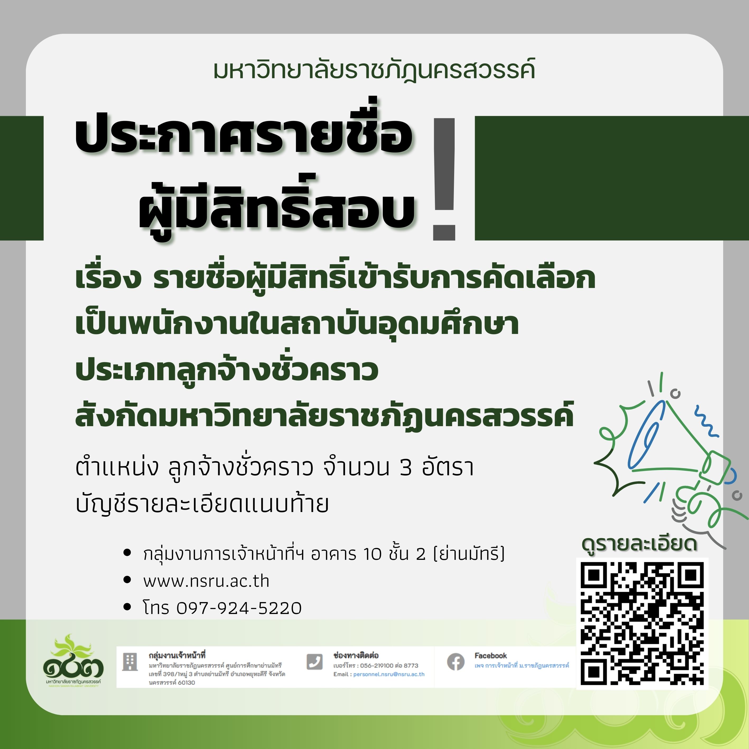 รายชื่อผู้มีสิทธิ์เข้ารับการคัดเลือกเป็นพนักงานในสถาบันอุดมศึกษา ประเภทลูกจ้างชั่วคราว สังกัดมหาวิทยาลัยราชภัฏนครสวรรค์