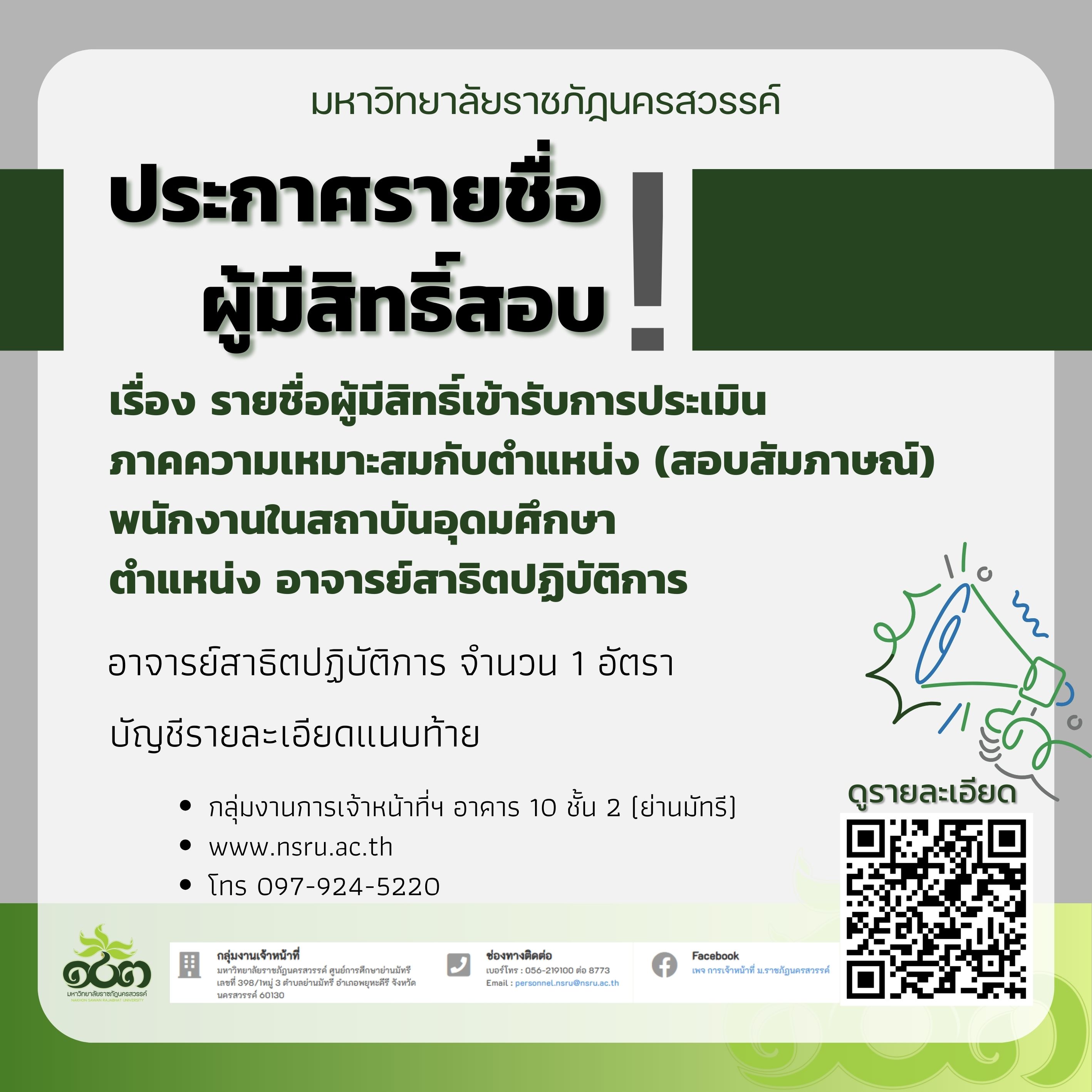 รายชื่อผู้มีสิทธิ์เข้ารับการประเมินภาคความเหมาะสมกับตำแหน่ง (สอบสัมภาษณ์) พนักงานในสถาบันอุดมศึกษา ตำแหน่ง อาจารย์สาธิตปฏิบัติการ