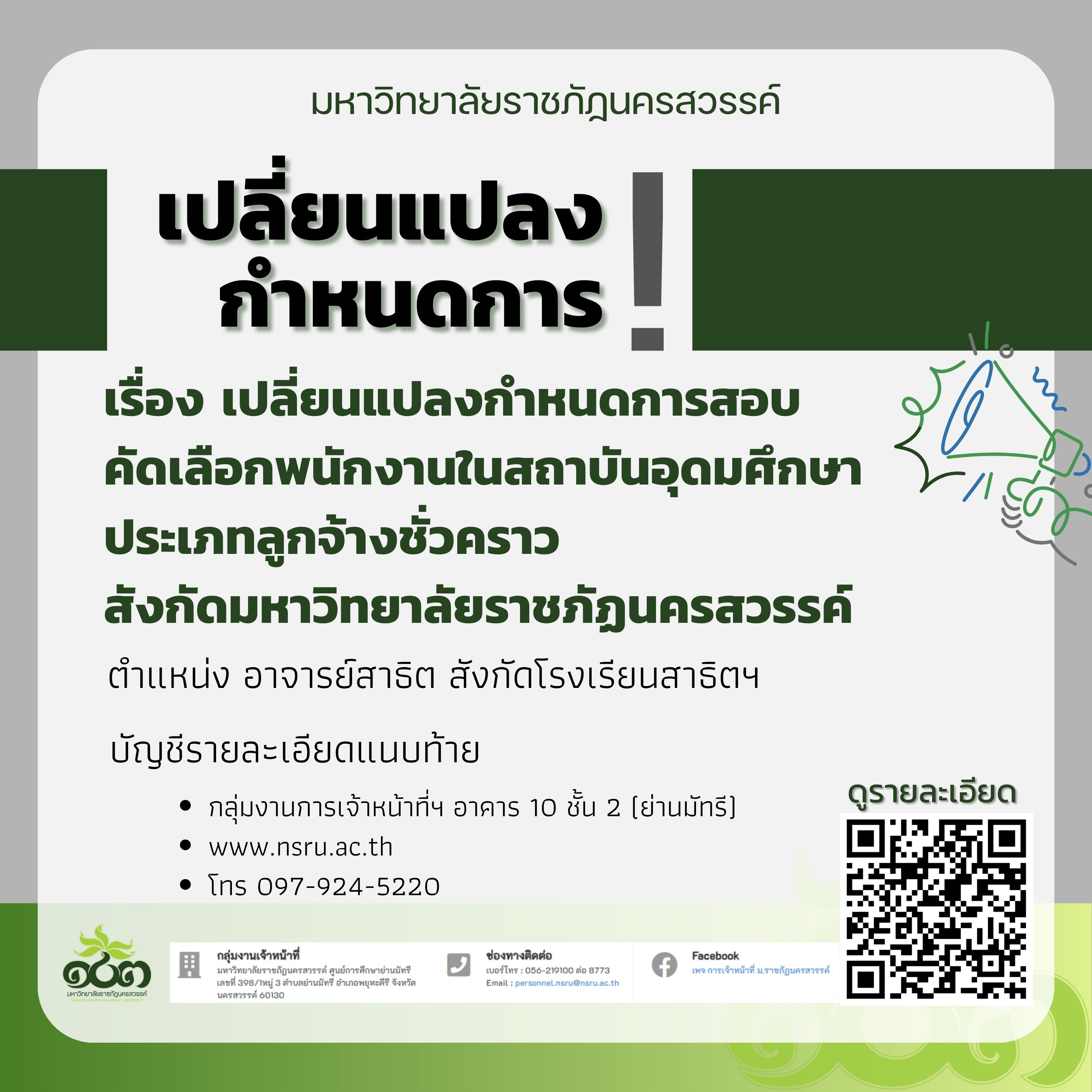 เปลี่ยนแปลงกำหนดการสอบคัดเลือกพนักงานในสถาบันอุดมศึกษา ประเภทลูกจ้างชั่วคราว สังกัดมหาวิทยาลัยราชภัฏนครสวรรค์