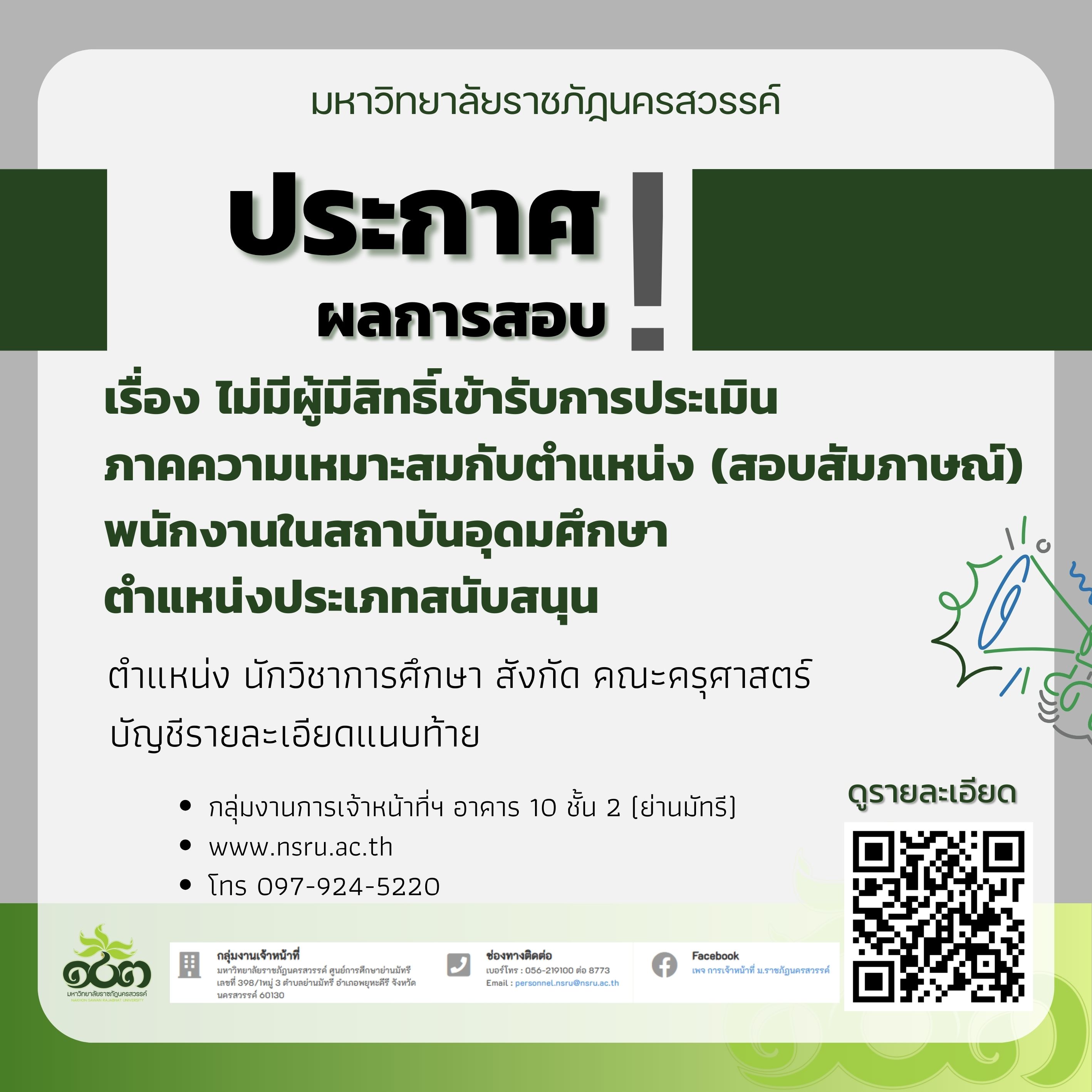 ไม่มีผู้มีสิทธิ์เข้ารับการประเมินภาคความเหมาะสมกับตำแหน่ง (สอบสัมภาษณ์) พนักงานในสถาบันอุดมศึกษา ตำแหน่งประเภทสนับสนุน