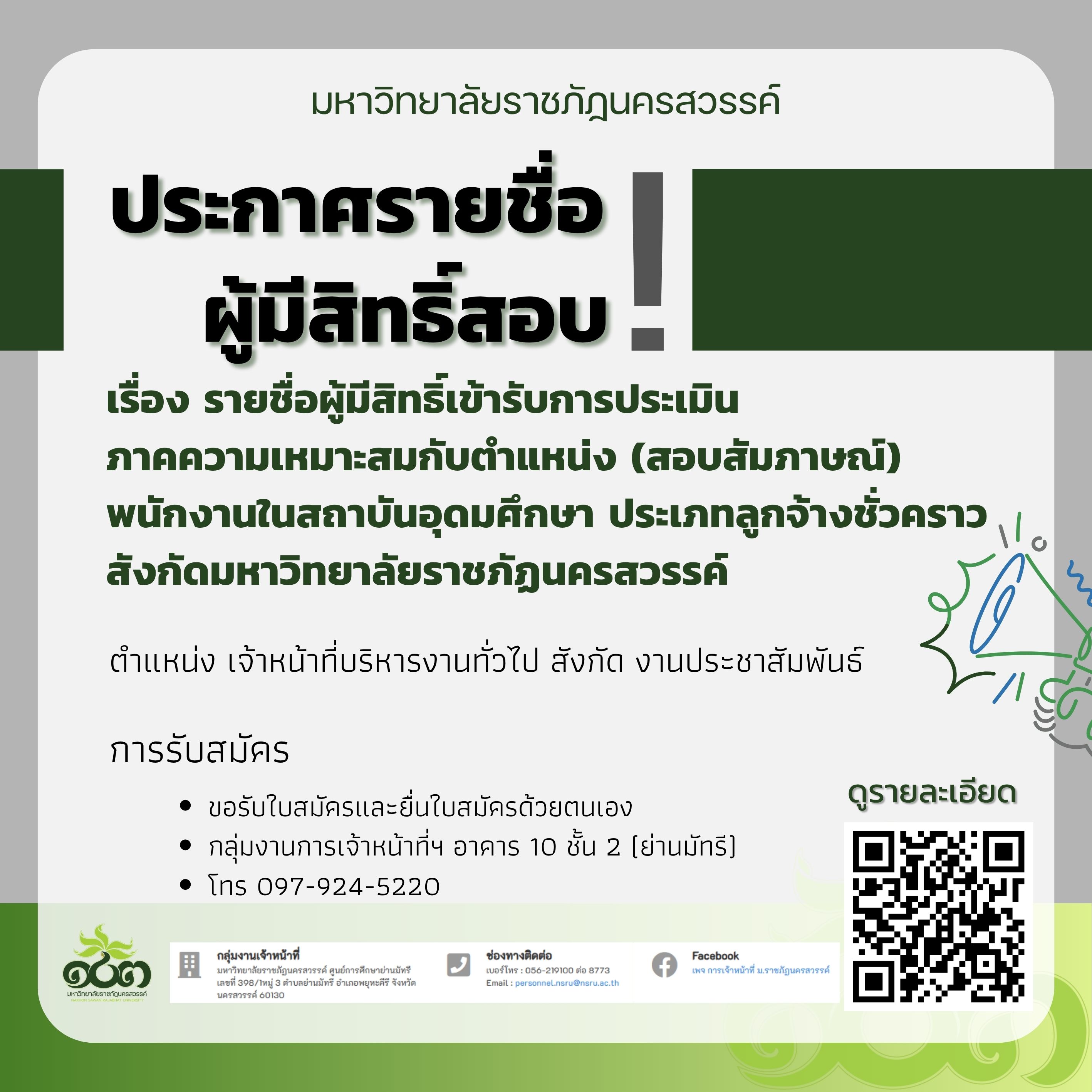 รายชื่อผู้มีสิทธิ์เข้ารับการประเมินภาคความเหมาะสมกับตำแหน่ง (สอบสัมภาษณ์) พนักงานในสถาบันอุดมศึกษา ประเภทลูกจ้างชั่วคราว สังกัดมหาวิทยาลัยราชภัฏนครสวรรค์