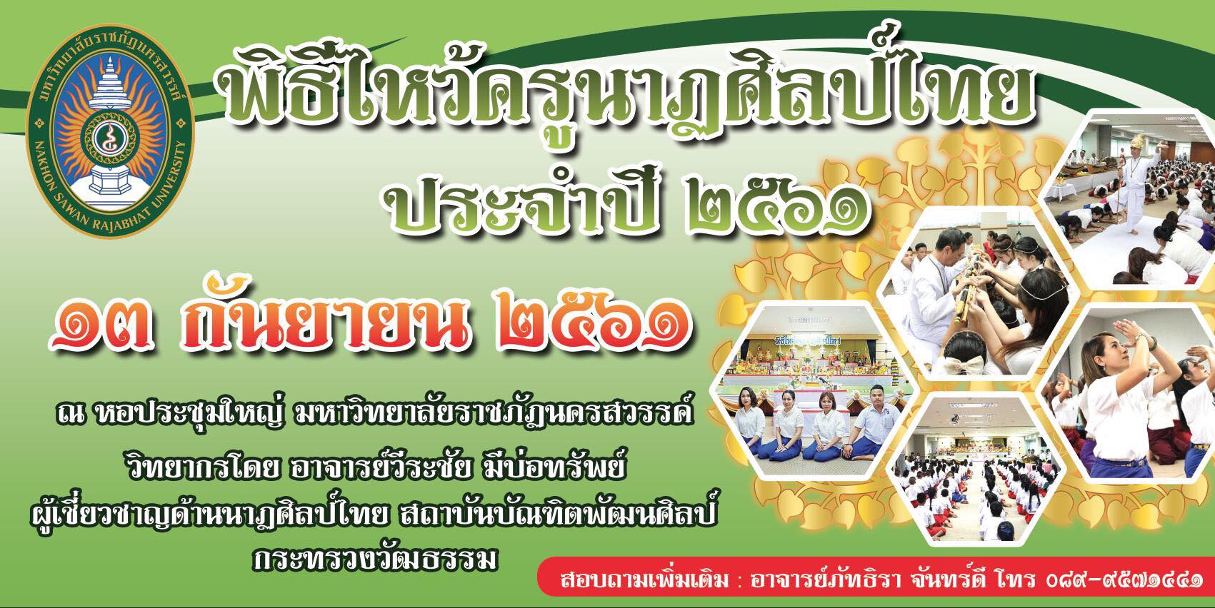 สาขาวิชานาฏศิลป์ คณะมนุษยศาสตร์และสังคมศาสตร์ มหาวิทยาลัยราชภัฏนครสวรรค์ ขอเชิญร่วมพิธีไหว้ครูนาฏศิลป์ไทย ประจำปี 2561 ในวันพฤหัสบดีที่ 13 กันยายน 2561 ณ หอประชุมมหาวิทยาลัยราชภัฏนครสวรรค์