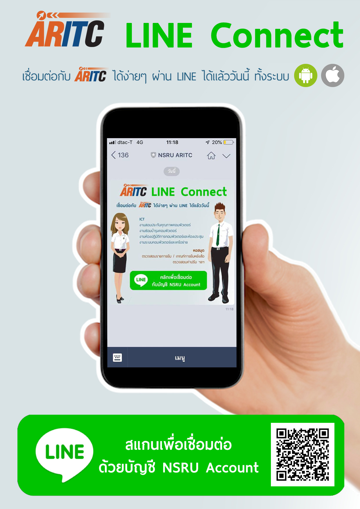 นักศึกษา อาจารย์ และเจ้าหน้าที่ สามารถเชื่อมต่อ "ARITC Line Connect" ได้แล้ววันนี้!!! ที่ https://line.me/R/ti/p/%40isf2733x หรือ สแกน QR Code เพิ่มเพื่อนผ่านทาง Line Application เพื่อสอบถามข้อมูล และรับข่าวสารงานบริการของสำนักวิทยบริการฯ เช่น
