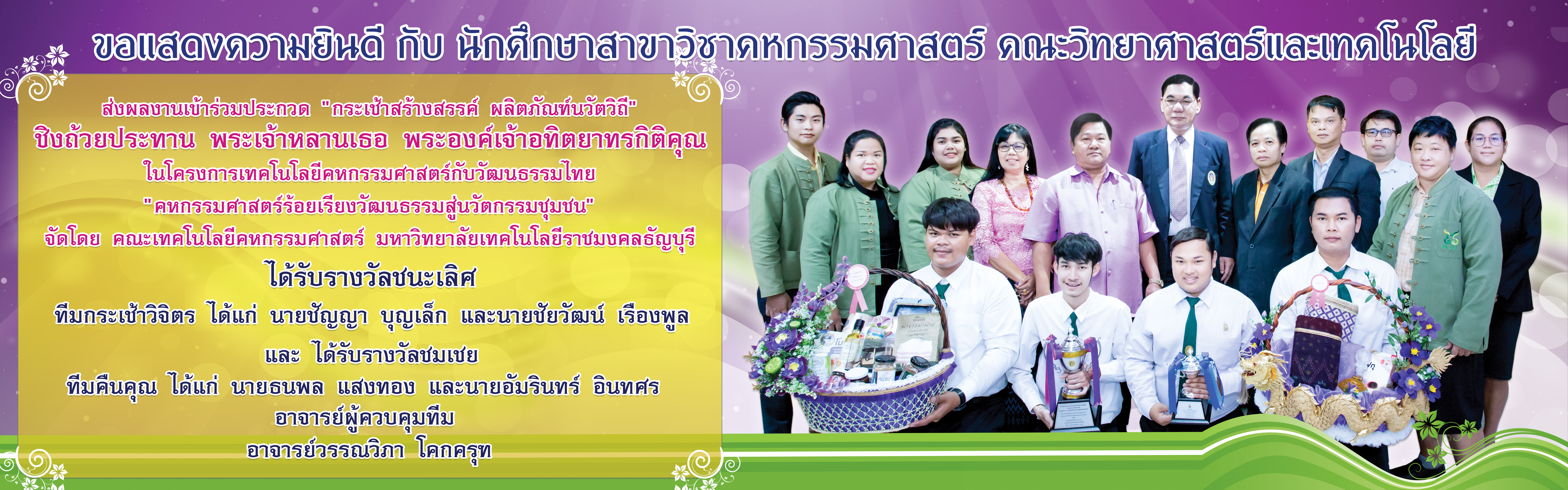 ขอแสดงความยินดี กับ นักศึกษาสาขาวิชาคหกรรมศาสตร์ คณะวิทยาศาสตร์และเทคโนโลยี ส่งผลงานเข้าร่วมประกวด "กระเช้าสร้างสรรค์ ผลิตภัณฑ์นวัตวิถี" ชิงถ้วยประทาน พระเจ้าหลานเธอ พระองค์เจ้าอทิตยาทรกิติคุณ ในโครงการเทคโนโลยีคหกรรมศาสตร์กับวัฒนธรรมไทย "คหกรรมศาสตร์ร้อยเรียงวัฒนธรรมสู่นวัตกรรมชุมชน" ในวันพฤหัสบดีที่ 7 มีนาคม 2562 จัดโดย คณะเทคโนโลยีคหกรรมศาสตร์ มหาวิทยาลัยเทคโนโลยีราชมงคลธัญบุรี ณ ศูนย์การค้าสเปลล์ และฟิวเจอร์พาร์ค รังสิต (ฝั่งเซ็นทรัล) จังหวัดปทุมธานี จากผลการแข่งขันสามารถได้รับรางวัลจากการแข่งขัน จำนวน 2 รางวัล ประกอบด้วย รางวัลชนะเลิศ ทีมกระเช้าวิจิตร ได้แก่ นายชัญญา บุญเล็ก และนายชัยวัฒน์ เรืองพูล และ รางวัลชมเชย ทีมคืนคุณ ได้แก่ นายธนพล แสงทอง และนายอัมรินทร์ อินทศร อาจารย์ผู้ควบคุมทีม อาจารย์วรรณวิภา โคกครุฑ