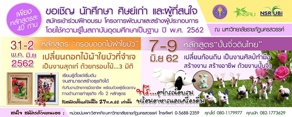 //หน่วยบ่มเพาะวิสาหกิจมหาวิทยาลัยราชภัฏนครสวรรค์ ขอเชิญผู้ที่สนใจ เข้ารับการฝึกอบรมทักษะอาชีพ โดยมีให้เลือก 2 หลักสูตร //รับสมัครที่ หน่วยบ่มเพาะวิสาหกิจมหาวิทยาลัยราชภัฏนครสวรรค์ (UBI) อาคารโรงแรมต้นน้ำ ชั้น 1 โดยเตรียมสำเนาบัตรประชาชนพร้อมเงินมัดจำการลงทะเบียน จำนวน 500 บาท (***ได้รับคืนเต็มจำนวนในวันสุดท้ายของการฝึกอบรมเมื่อเข้าอบรมครบ 3 วัน) //ขอสงวนสิทธิ์การอบรมครั้งนี้ สำหรับผู้ที่ไม่เคยเข้าอบรมกับ UBI และสามารถเข้ารับการอบรมได้ครบทั้ง 3 วัน
