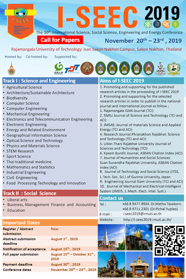 คณะวิศวกรรมศาสตร์ มหาวิทยาลัยธรรมศาสตร์ ขอเชิญร่วมการประชุมวิชาการนานาชาติ ICEEE 2019 (6Th International Conference on Engineering, Energy and Environment 2019) ระหว่างวันที่ ๒๗ -๒๙ พฤศจิกายน ๒๕๖๒ ณ โรงแรมแอมบาสซาเดอร์ กรุงเทพฯ ในหัวข้อเรื่อง "Social Innovation for Sustainable Development" เพื่อสร้างความสัมพัน์ พร้อมทั้งเผยแพร่ผลงานวิชาการของคณาจารย์ และแลกเปลี่ยนความคิดเห็นกับนักวิชาการต่างประเทศ สามารถศึกษารายละเอียดเพิ่มเติมได้ที่ http://iceee.engr.tu.ac.th/ หรือ สอบุุถามรายละเอียดได้ที่ คณะวิศวกรรมศาสตร์ มหาวิทยาลัยธรรมศาสตร์ โทร. ๐ ๒๕๖๔ ๐๐๑ - ๙ ต่อ ๓๐๐๑ โทรสาร ๐ ๒๕๖๔ ๓๐๑๐ Website : http://www.engr.tu.ac.th